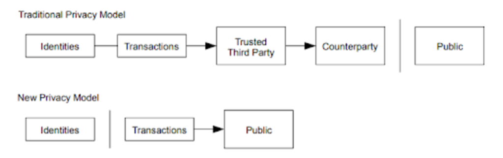 The traditional banking model achieves a level of privacy by limiting access to information to the parties involved and the trusted third party. The necessity to announce all transactions publicly precludes this method, but privacy can still be maintained by breaking the flow of information in another place: by keeping public keys anonymous. The public can see that someone is sending an amount to someone else, but without information linking the transaction to anyone. This is similar to the level of information released by stock exchanges, where the time and size of individual trades, the “tape”, is made public, but without telling who the parties were.